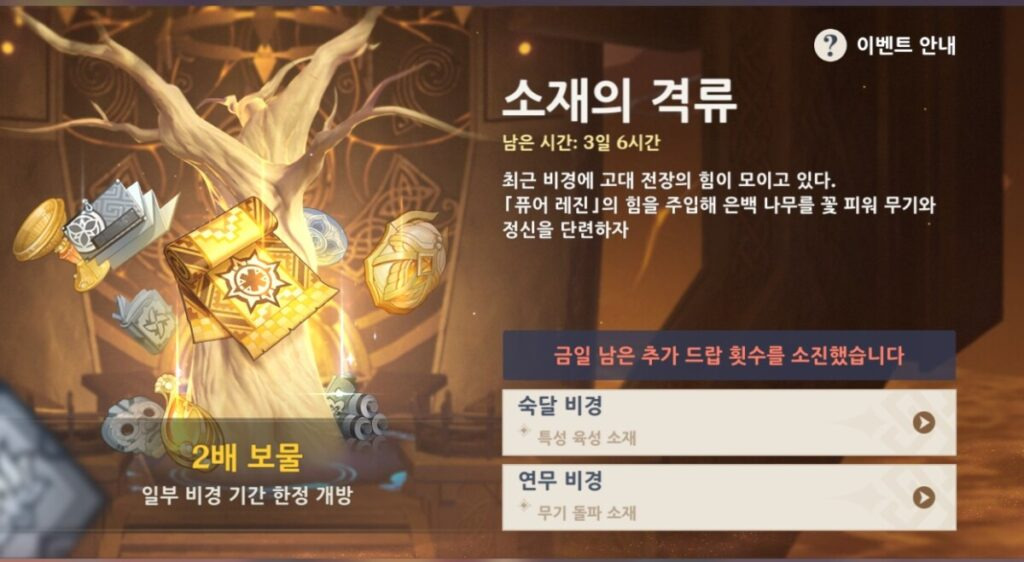 이번 '소재의 격류'에는 요일에 상관 없이 원하는 모든 비경을 돌 수 있습니다. 파밍해야 할 재료가 있다면 이번 찬스를 잘 이용하시면 좋을 듯 한데요. 2배의 보물을 받기 위해선 농축레진은 사용하면 안된다는 점 명심하세요.