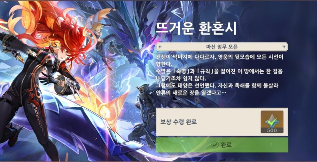 정해긴 기간 내 불의 신 '마비카'의 마신임무를 완료하시면 500개의 원석을 받으실 수 있습니다.