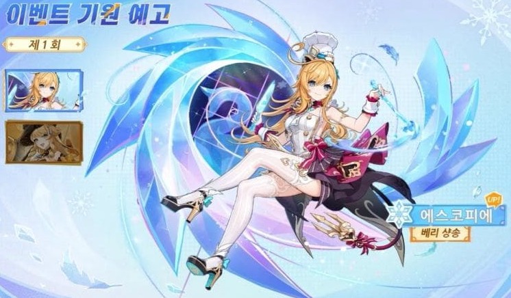 에스코피에의 경우 빙결 보조 뿐만 아니라 서브딜러로서 가치가 있으며 5.7에 출시가 예상되는 스커크와 조합이 좋을 것으로 예상되어 스커크를 노리시는 분이라면 한번 고민을 해보셔야 할 픽업입니다.