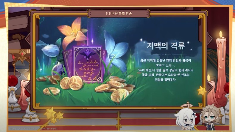 며칠전이었죠. 드디어 원신 5.6 업데이트에 대한 방송이 있었습니다. 5.6에 스커크가 나올 수 있다는 찌라시가 돌긴 했지만 이번에 없는 걸로 봐선 5.7에 나올 확률이 매우 높아졌네요.