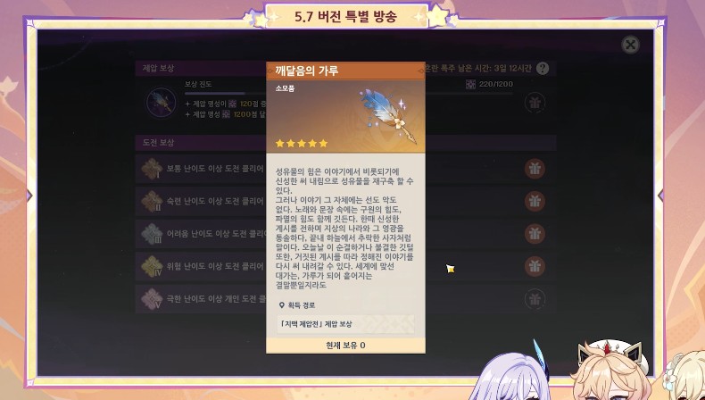 매 버전 지맥 제압전 콘텐츠를 통해 3개의 '깨달음의 가루'를 무료로 획득 할 수 있고 진주기행/진주의 노래 보상으로 1개씩 얻을 수 있습니다.