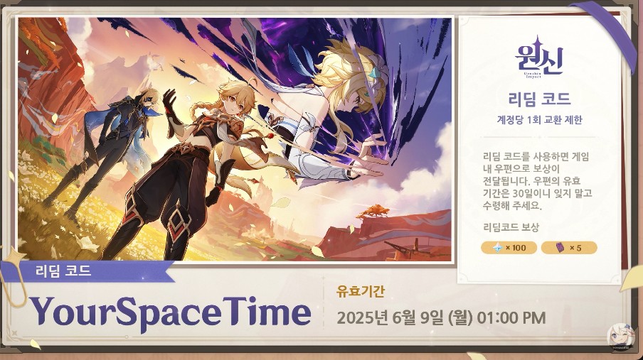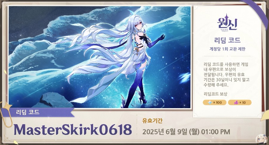 리딤코드는 6월 9일 월요일 오후 1시까지 입력을 하셔야 하고 수령시간은 30일 입니다.
