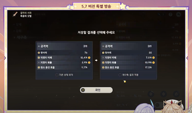 기존 5성 성유물 중 20렙가지 올린 성유물이 있다면 부속성을 다시 랜덤으로 설정을 해주는 아이템입니다. 사용전에는 강화하고 싶은 일부 속성을 지정할 수 있으며 사용후에는 기존 강화상태를 유지할지 변경된 강화상태로 바꿀지 선택할 수 있습니다.