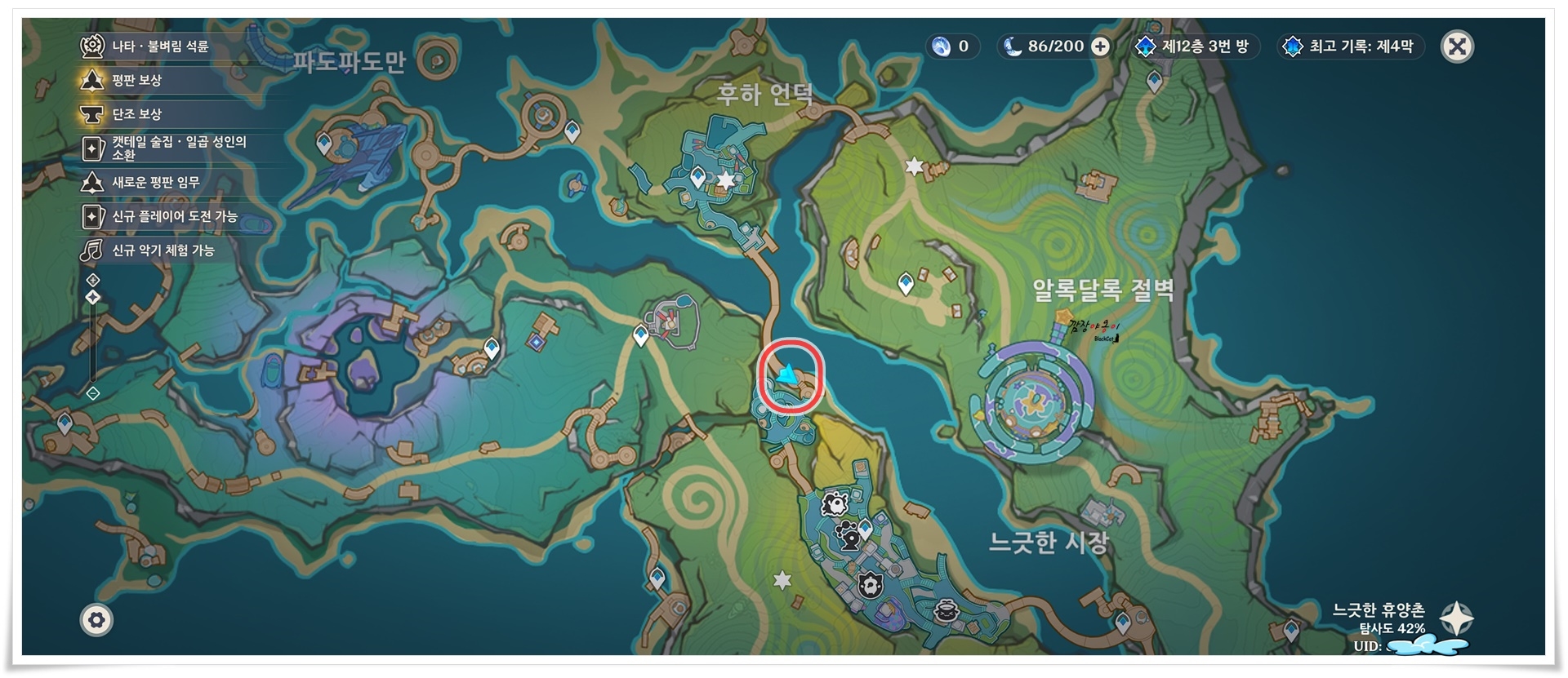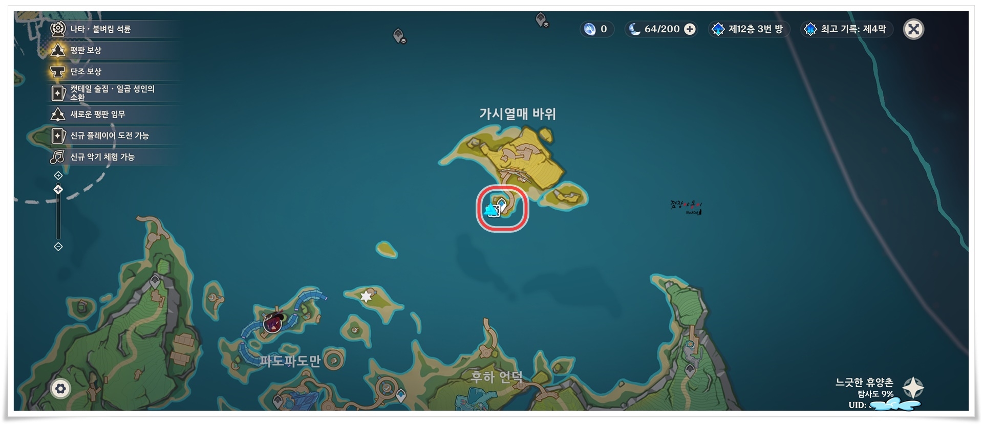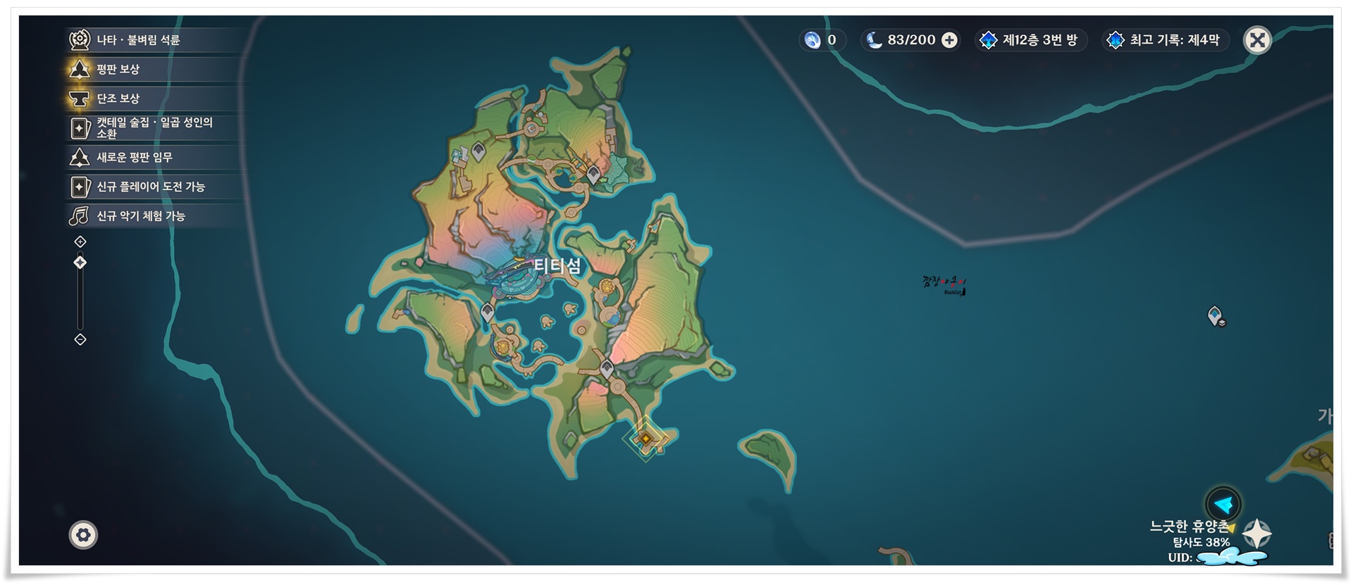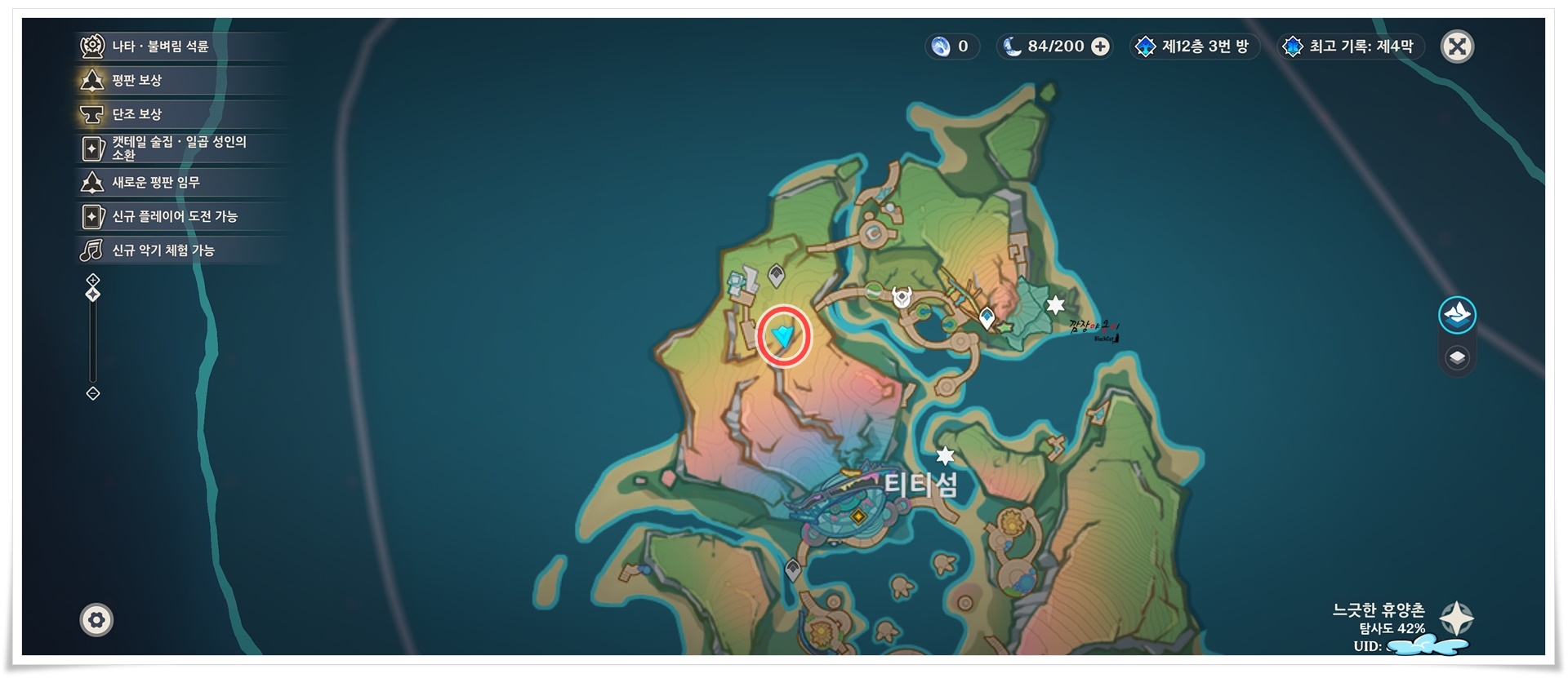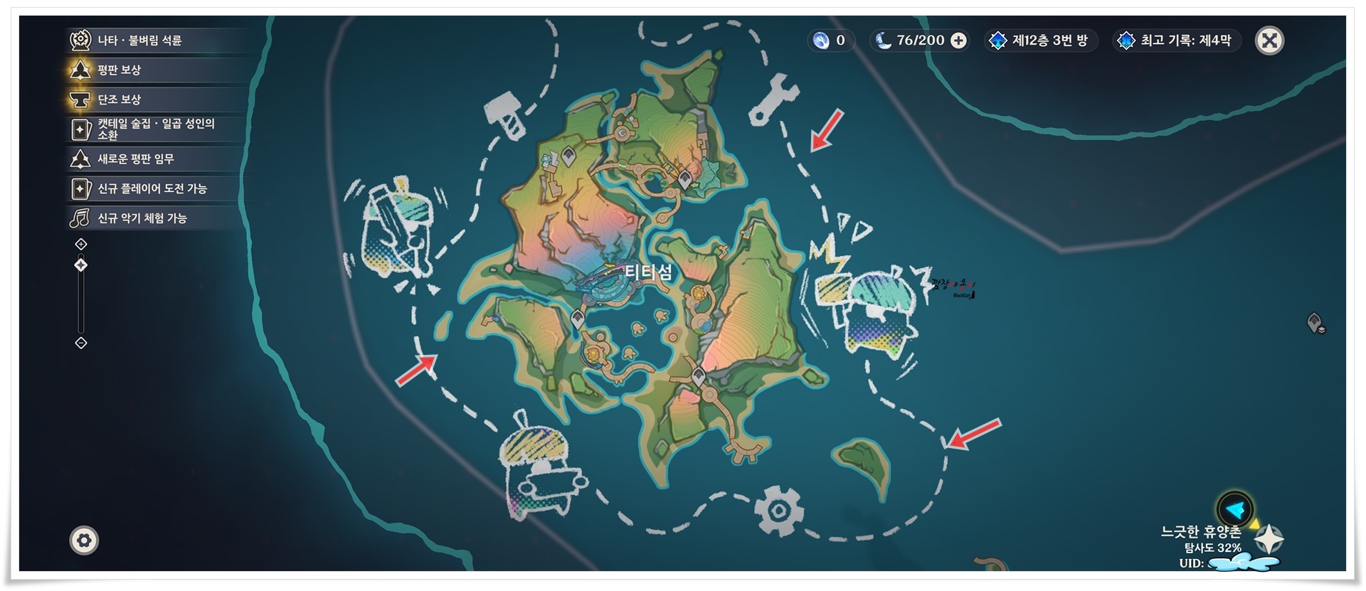 티티섬 주위로 점선이 그어져 있다면 아직 이 지역을 갈 수 없다는 뜻이며 다른 지역처럼 점선이 없다면 해금되었으니 갈 수 있다는 뜻입니다.