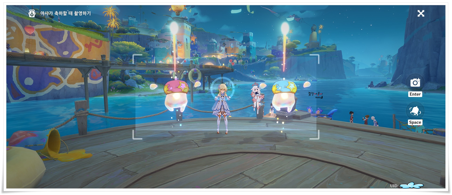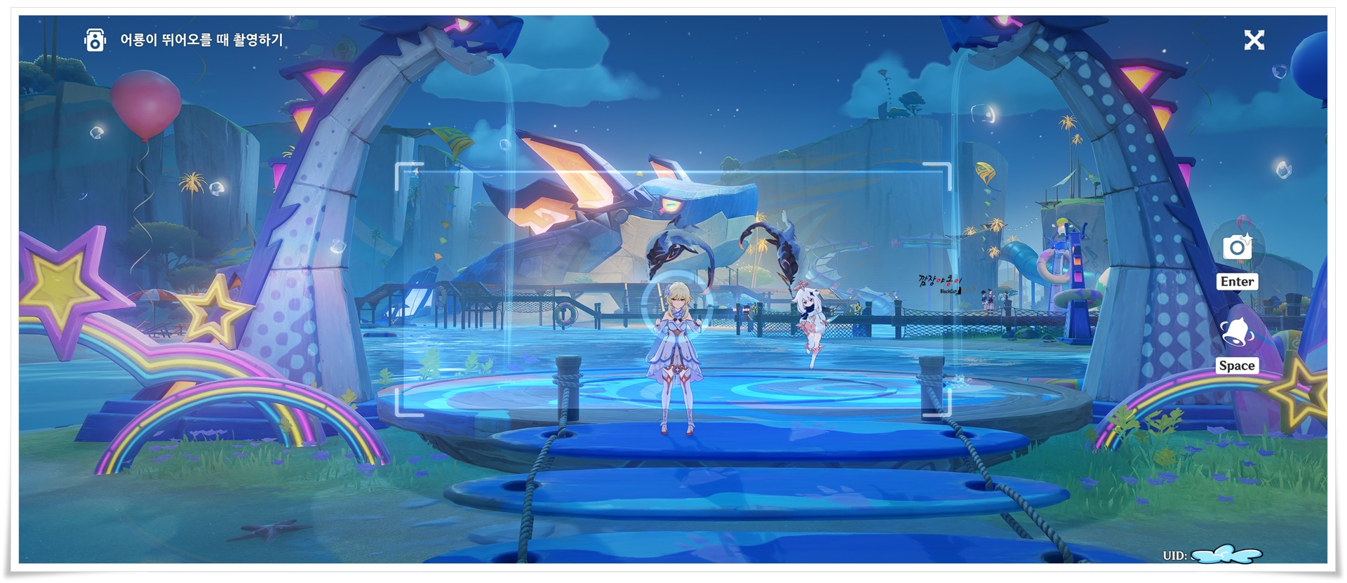 스페이스바를 누른 뒤, 뒤쪽에 어룡이 뛰어오르는 타이밍에 엔터키를 눌러 촬영을 하시면 됩니다.