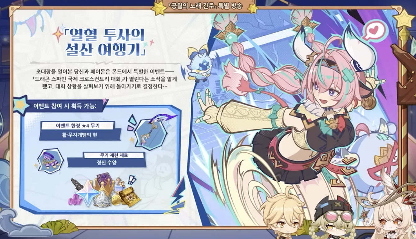 전반부에는 새로운 캐릭터 '두린'의등장과 함께 초대 5성 캐릭터인 벤티가 복각을 합니다. 예전에는 5성 불속성 캐릭터가 정말 부족했었는데 나타때 부터 꾸준히 불속성 캐릭터들이 출시되어 이젠 제법 포지션지 좋으편이네요.