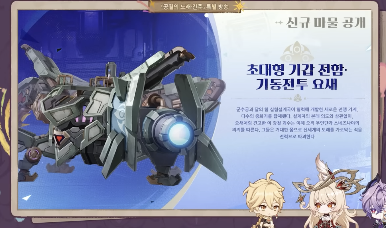 신규 마물 '초대형 기갑 전함 기동전투 요새'가 등장을 합니다. 노드크라이 '달의힘 실험 설계국'에 로봇이 많던데 아마도 그쪽과 관련이 있지 않을까 싶네요.