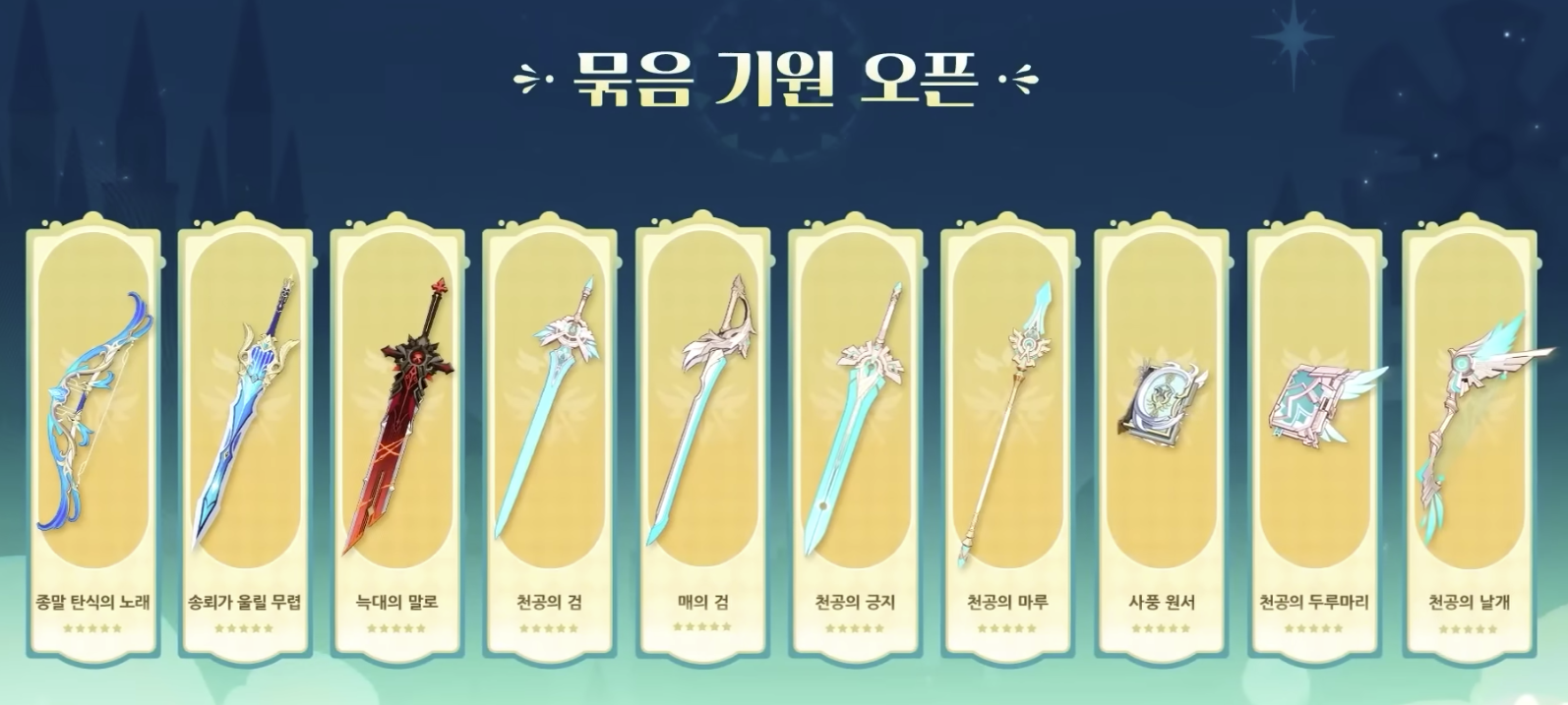 이미 캐릭터에서 반천을 하고 50뽑을 적립해놨다고 한들 묶음기원은 따로 1뽑부서 다시 시작이니 진짜로 필요한 캐릭터 & 무기인지 잘 고민하시고 들어가셔야 합니다.