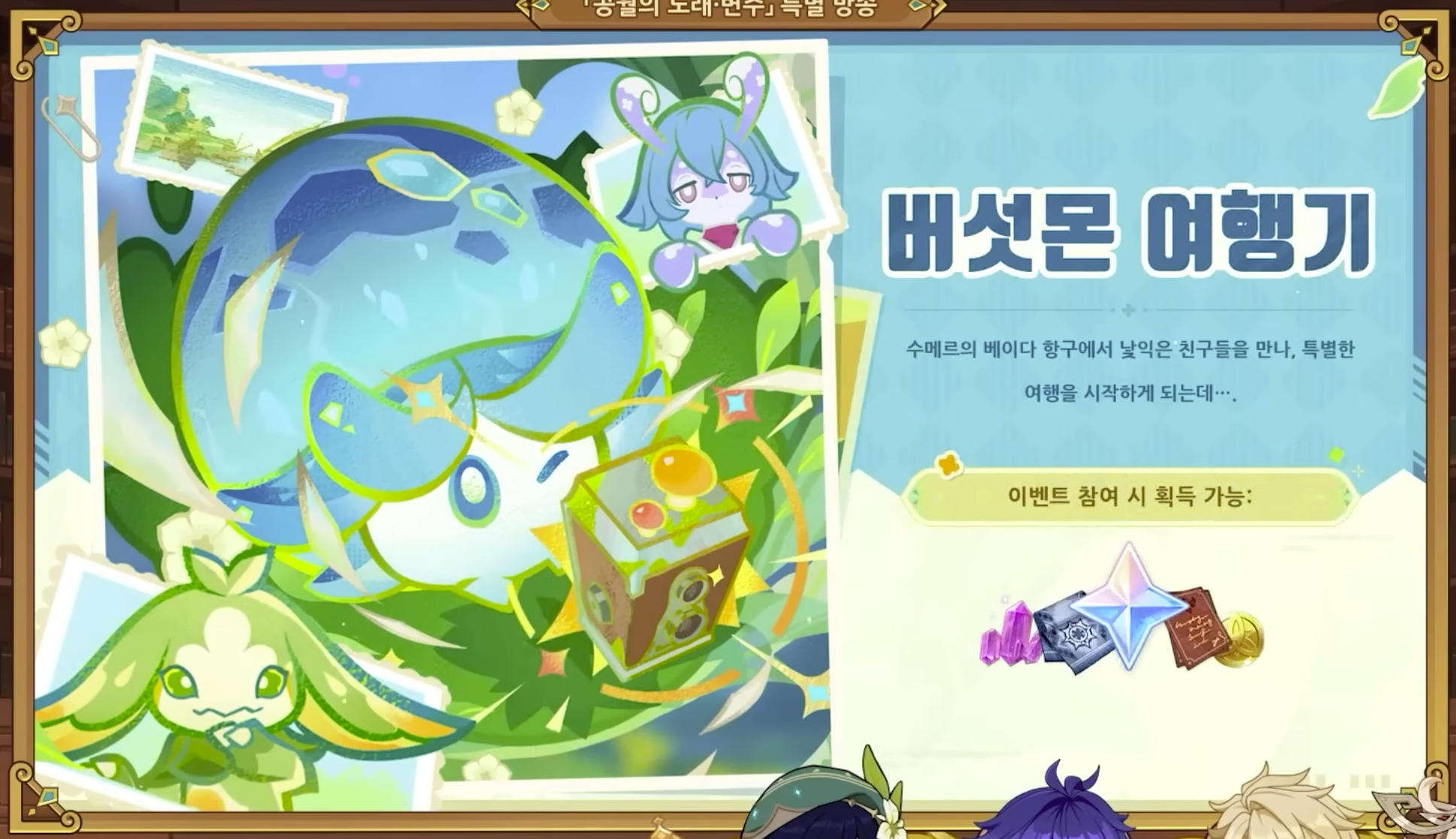 수메르에서 펼쳐지는 이벤트로 전용 사진기를 이용해 나타, 수메르, 폰타인에 흩어져 있는 풍경을 이용한 퀘스트로 각도 조정이 필요한 이벤트입니다.