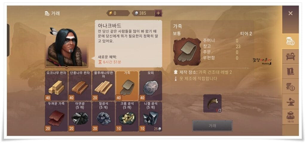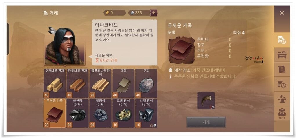 곰 발톱을 이용하면 가죽류로 교환 할 수 있는데요. '가죽'이 필요한 거라면 차라리 '실버턴'에 가서 '얇은 가죽'을 주고 교환 하는 걸 추천합니다. '얇은 가죽' 5개당 '가죽' 1개로 교환이 가능합니다.