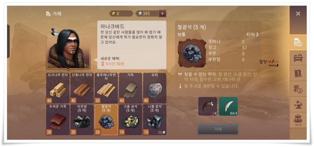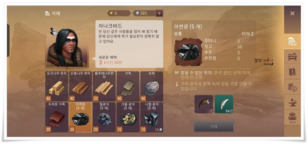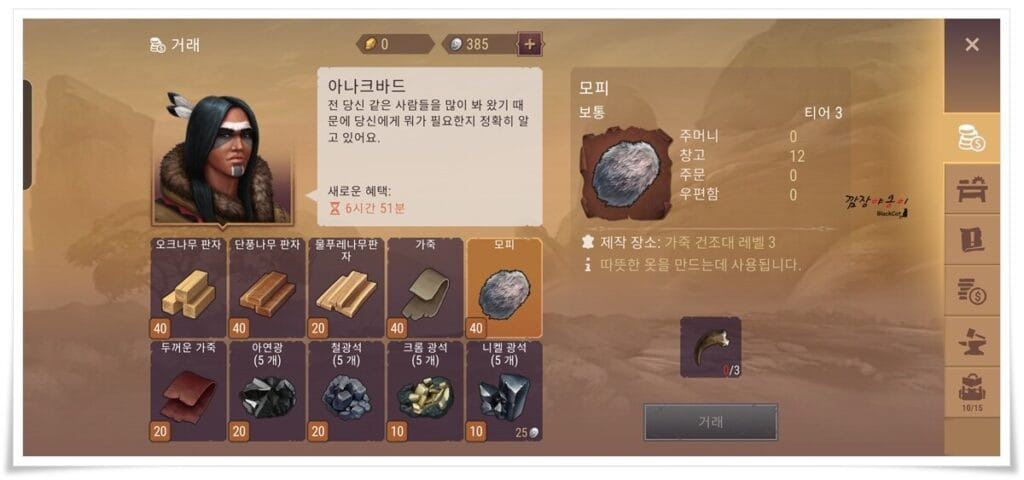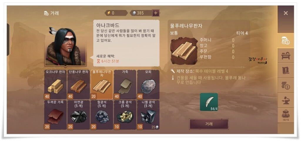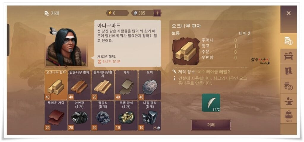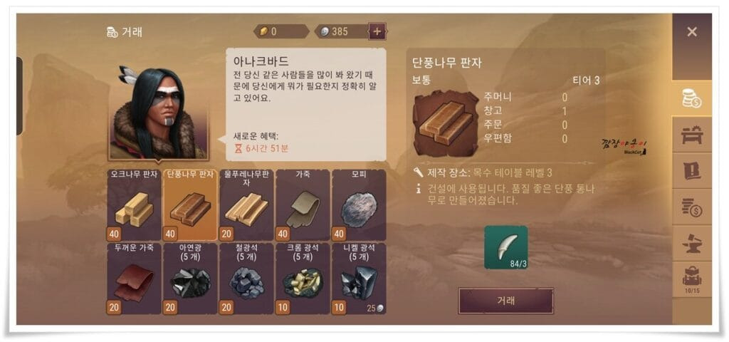 요즘 3티어로 올리는 중인데 단풍나무 판자가 많이 필요해 열심히 장작패로 다녔었는데 '아나크바드' 덕택에 단풍나무 판자를 조금 얻을 수 있었네요.