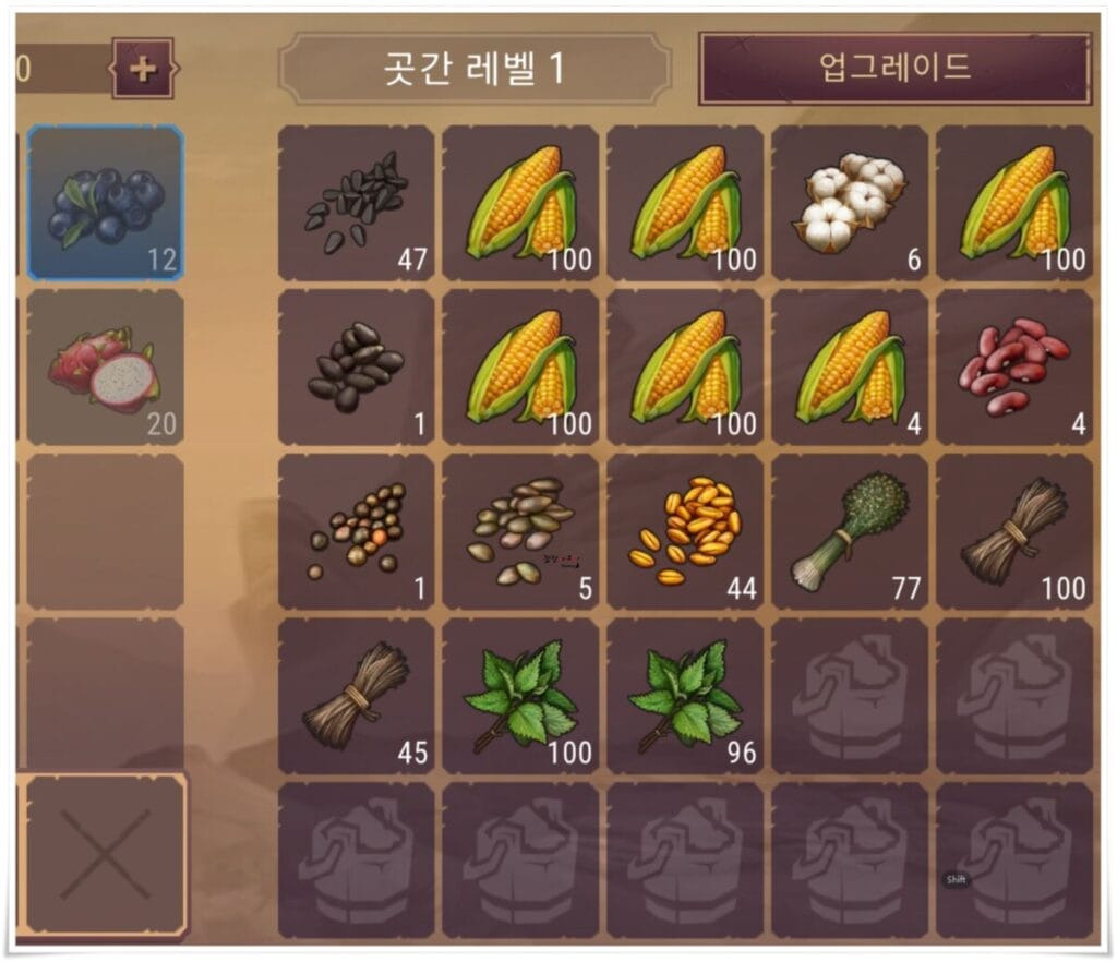 현재 제가 가지고 있는 품목으로 곳간에 저장이 가능한 물품과 그렇지 못한 물품으로 구분을 해봤는데요.