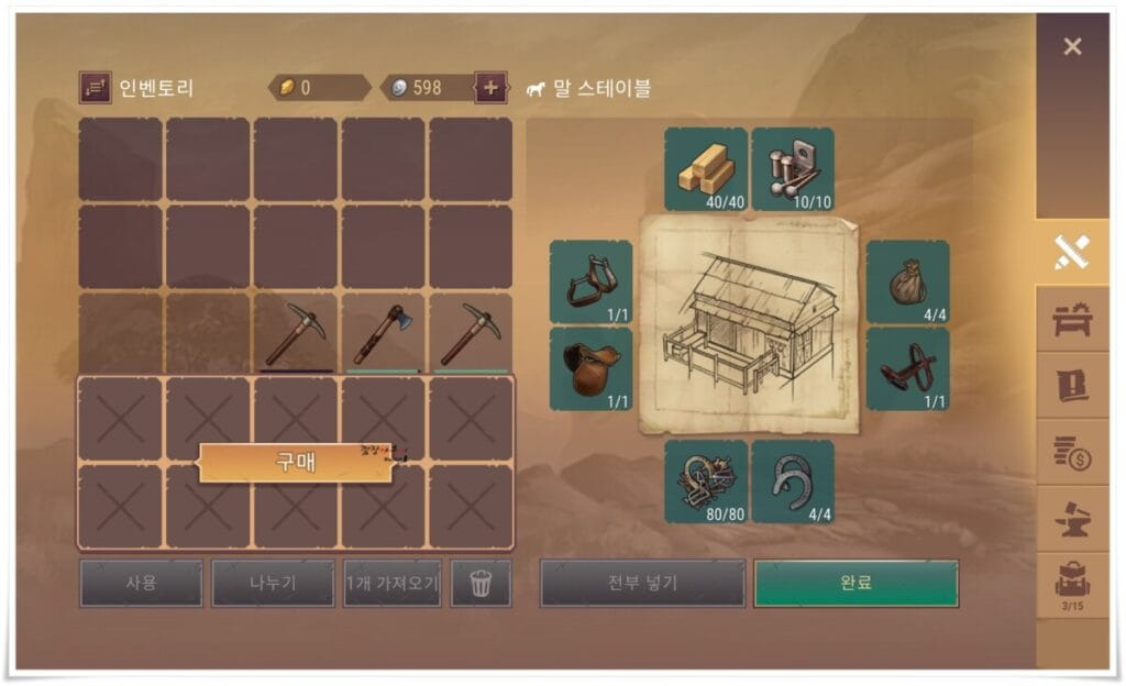 그리고 마구간을 건설하기 위해선 위 사진에서 보다시피 많은 재료를 파밍해 오셔야 하는데요.