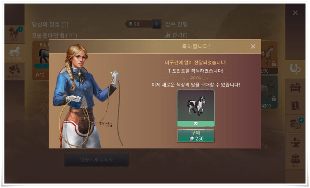 이렇게 동일한 말을 5번에 걸쳐 구매 후 판매를 하면 다음 단계인 희귀 등급의 '핀토 켄터키 말'의 락이 풀리게 됩니다.