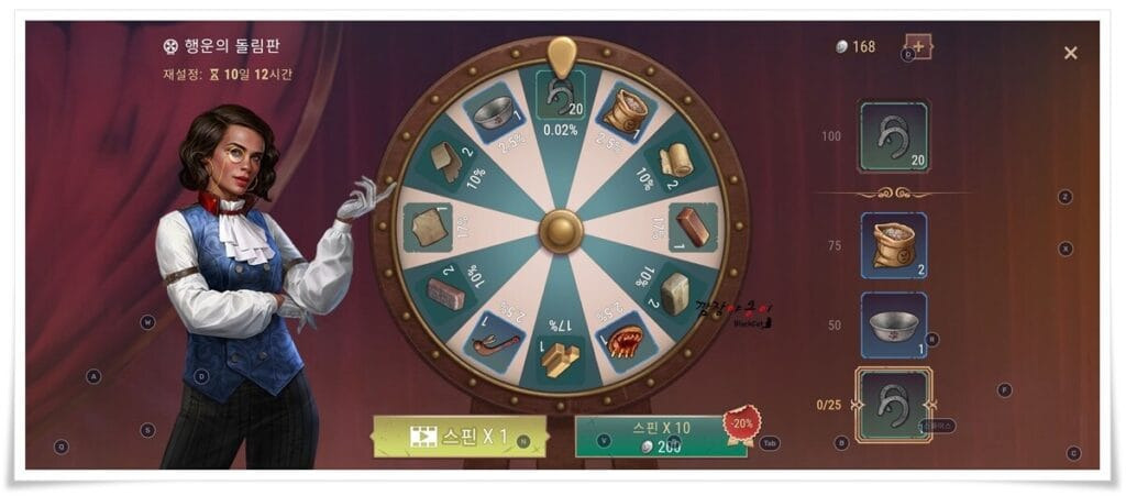7일 후 리셋되며 오른쪽 세로로 있는 아이템 숫자는 25번 뽑기를 하면 편자를 주고 50번을 뽑으면 펫 그릇을 준다는 의미입니다.