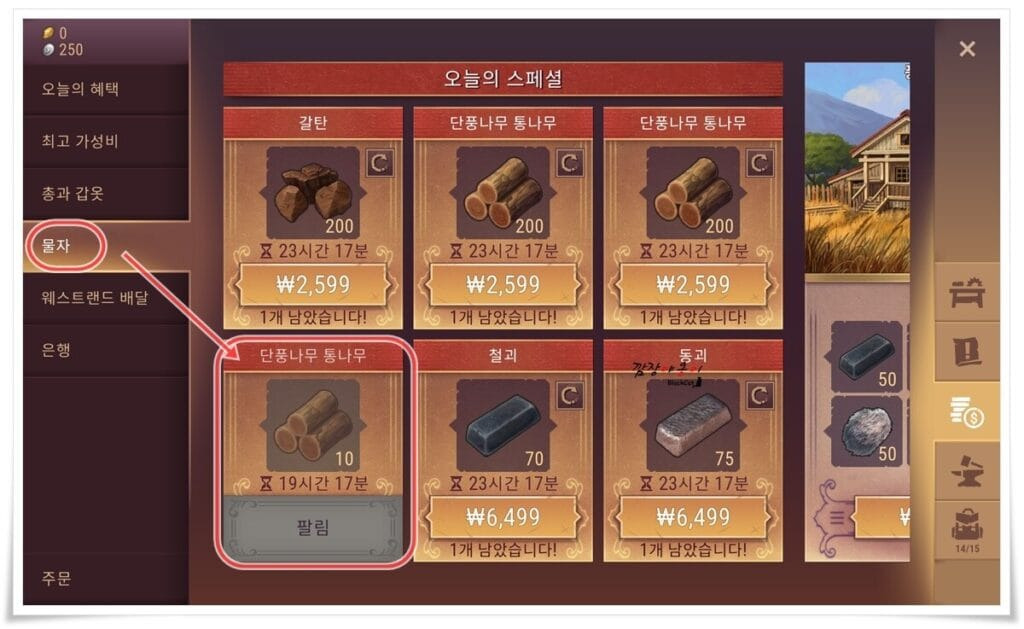 '물자' 항목에서도 '오늘의 스페셜' 아이템을 하나씩 얻을 수 있답니다. 요일에 따라 다른건지는 모르겠지만 단풍나무 통나무를 받을때도 있고 현무암을 받을때도 있고 아무래도 오늘의 스페셜에 포함된 아이템 중 매일 랜덤으로 나오는게 아닌가 싶네요.