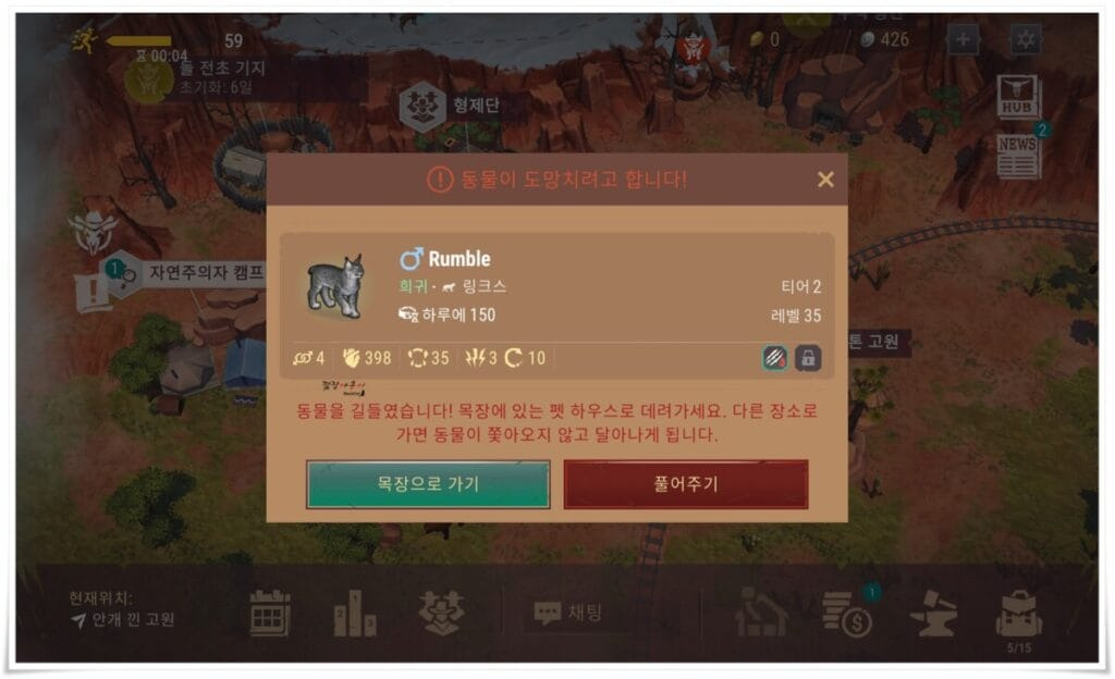 5분 이내에 목장으로 돌아가야 하니 뛸수 있는 행력은 충분히 구비한 상태에서 진행하셔야 중간에 펫을 놓치는 불상사를 피하실 수 있습니다.