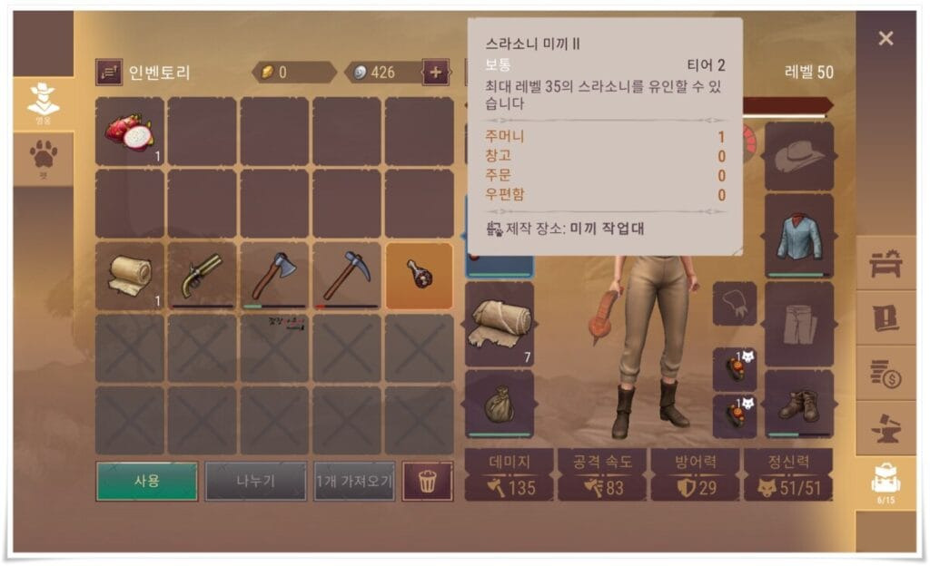 가방에서 미끼를 선택해 '사용하기'를 하시면 1단계 펫 꼬시기는 되었고 이제 5분 안에 집이 있는 목장으로 돌아가야 합니다.