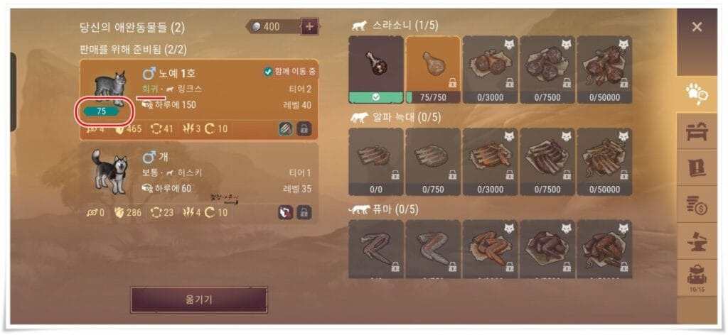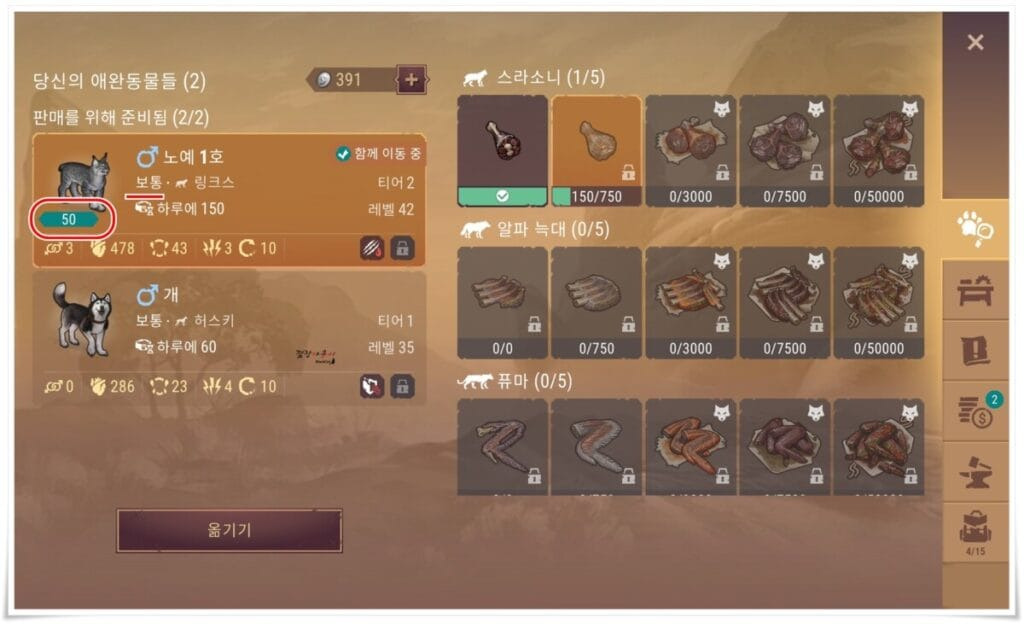 그럼 길들이기에 성공한(12시간 적응기까지 마친) 스라소니/ 늑대를 다시 주는 대신 3티어급 미끼 잠금 해제를 위한 포인트를 받을 수 있습니다.