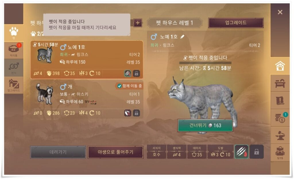 스라소니는 체력은 약하지만 공격력이 강한 펫이고 늑대는 반대로 체력은 강하지만 상대적으로 공격력이 약한 펫입니다.