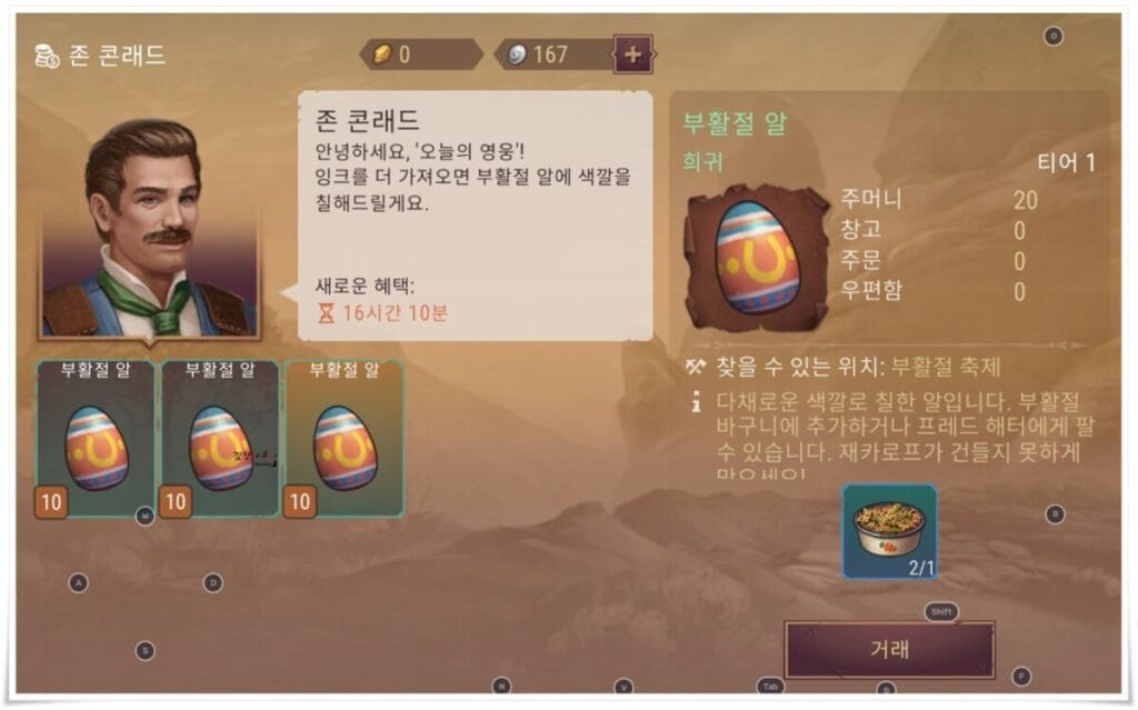 바구니 배송을 통해선 알을 얻을 수 있습니다. 앞서와 마찬가지로 하루 1회 무료, 25은화로 추가 1회 할 수 있어 하루 최대 2번까지 가능합니다.