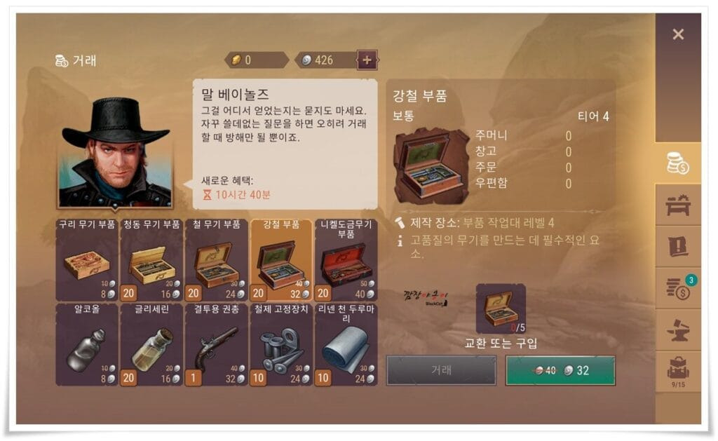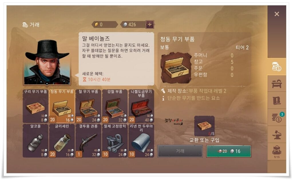 전 잡템을 이용해 '구리 무기 부품' 5개로 교환 한 뒤 다시 '청동 무기 부품' 1개로 교환을 했네요.