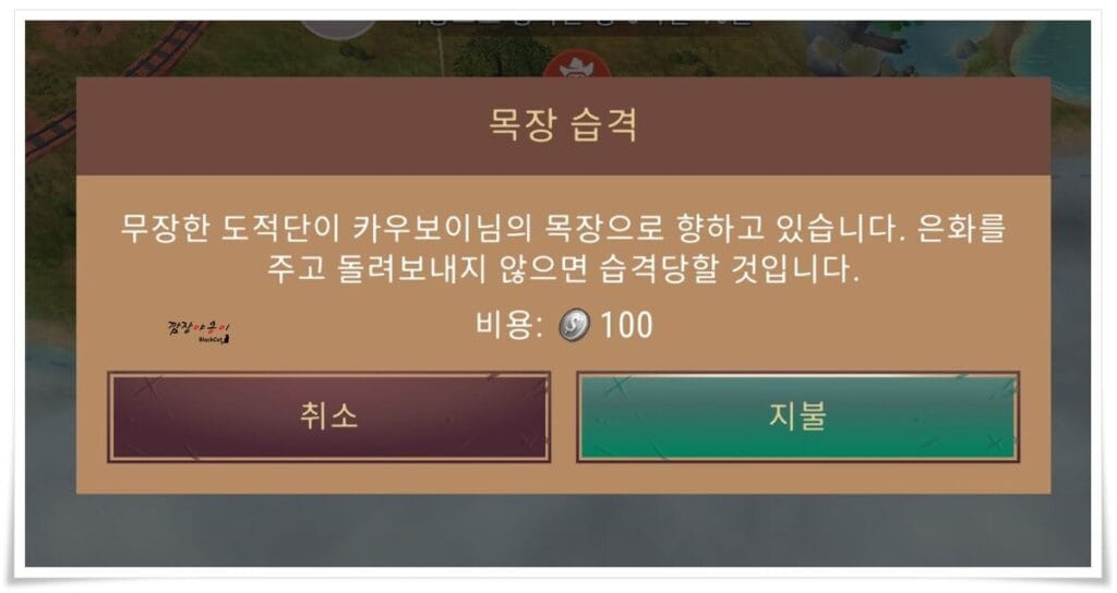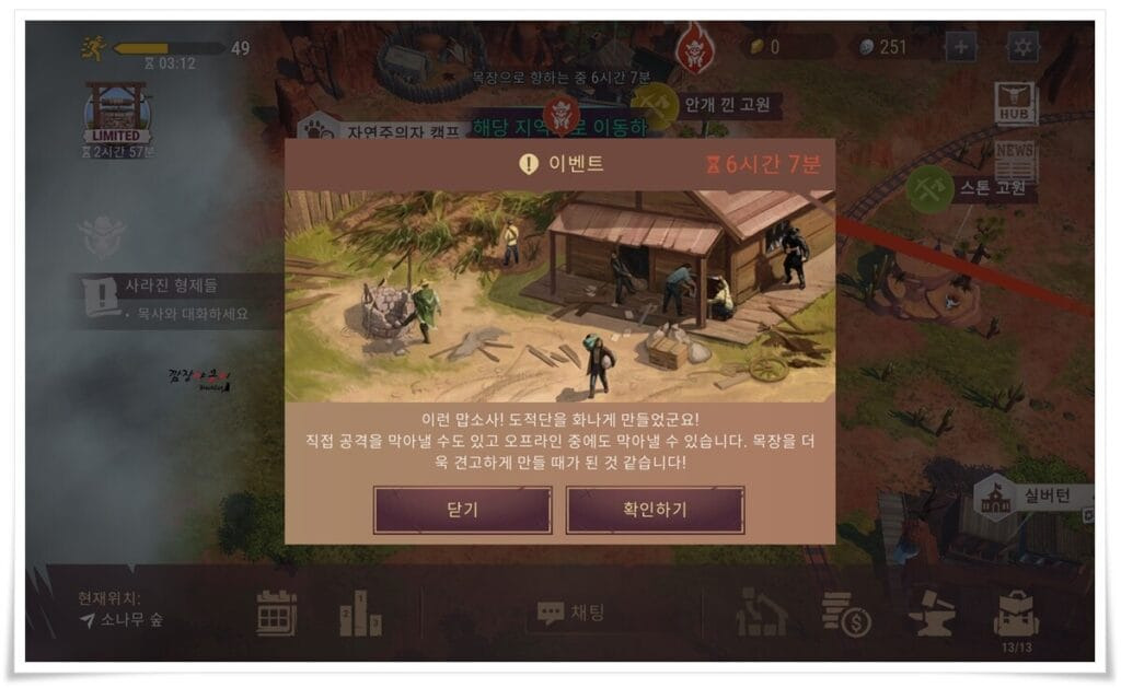 오늘은 모바일 게임 🔍웨스트랜드 서바이벌(홈페이지)의 내용 중 우측 상단에 있는 빨간게이지가 다 차면 발생하는 이벤트 노상강도 습격에 대해 알아보겠습니다.