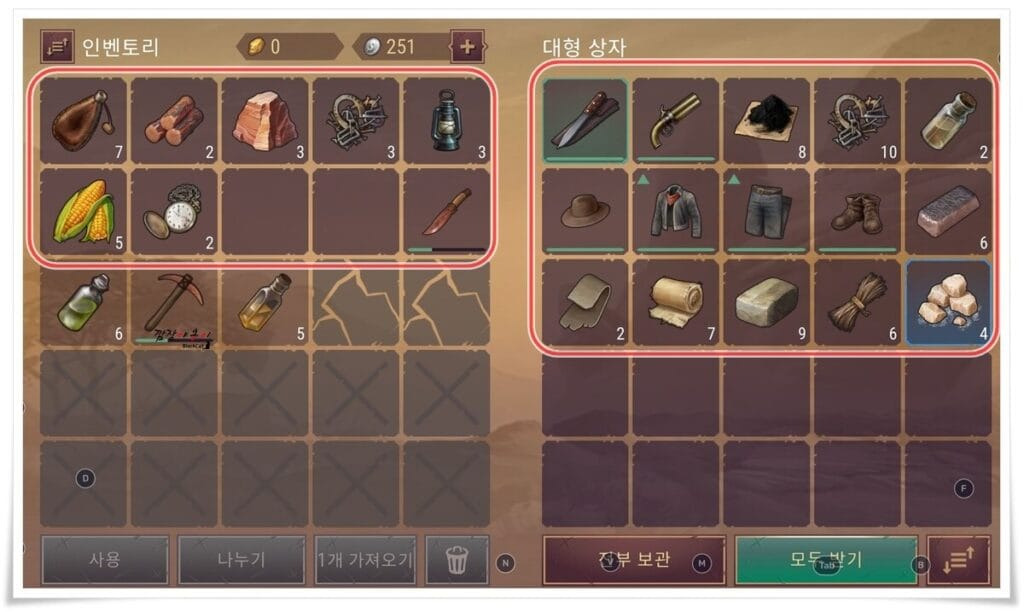 은닉처에 적은 딱 한명있었고 잡고나니 4개의 상자가 저를 기다리고 있네요. 빨간 사각형 안에 있는 아이템들이 모두 이번 빨간게이지가 모두차고 시작된 노상강도 습격 이벤트, 도적단 은닉처에서 얻은 아이템들인데 모두 가져올려면 15칸 가방/배낭을 이용해도 집을 한번 다녀와야 겠죠 ㅎ