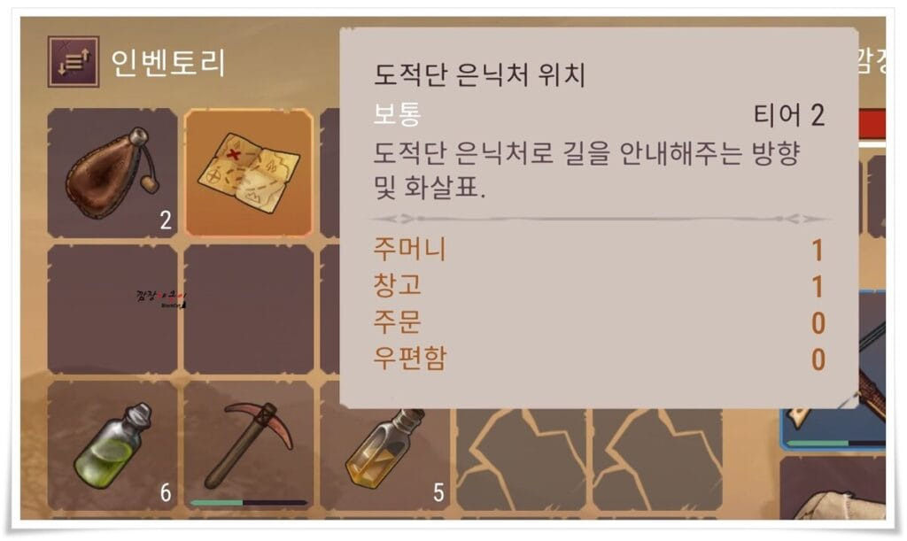 강도를 잡고 이녀석들이 흘린 아이탬을 뒤지다 보면 '도적단 은닉처 위치'가 나와있는 지도를 얻을 수 있습니다.