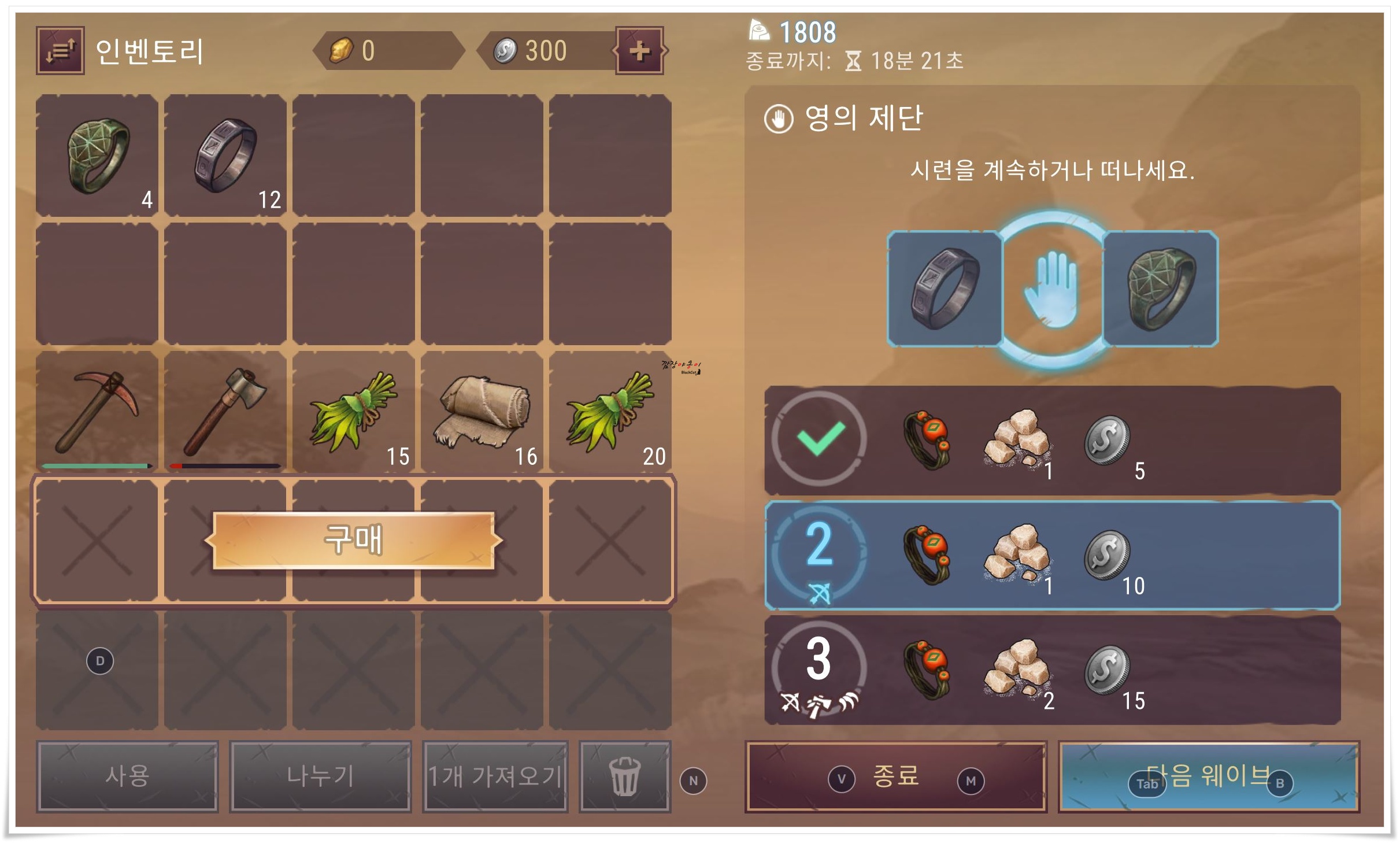 서브 퀘스트인 '마법의 장신구'를 진행중인 분이라면 5렙 이상의 반지가 필요하니 최소요건으로 획득이 가능한 10단계까지만 진행하시고 종료를 누르시면 됩니다.