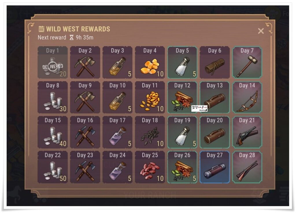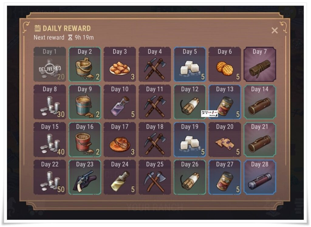 모든 게임이 비슷하겠지만 하루동안 해야 하는 일일퀘스트가 있고 접속만 하면 공짜로 주어지는 일일 접속보상이 있는데요. 다른게임과 마찬가지로 웨스트랜드 서바이벌 일일 접속보상이 있습니다.