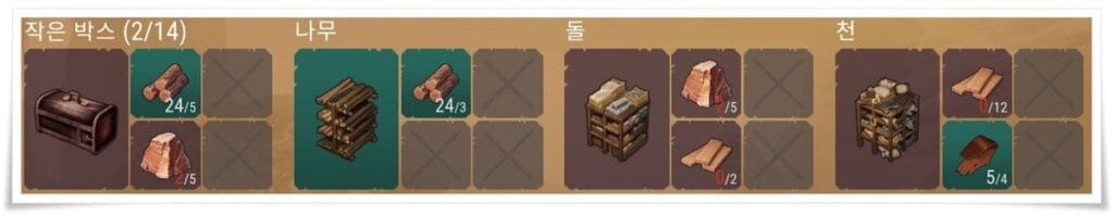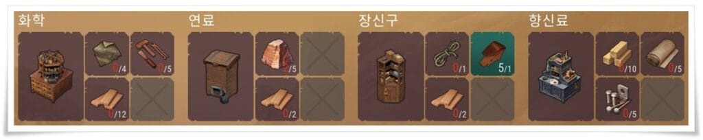 각 건설품에 대한 재료와 목록은 위 사진을 확인하시면 됩니다.
