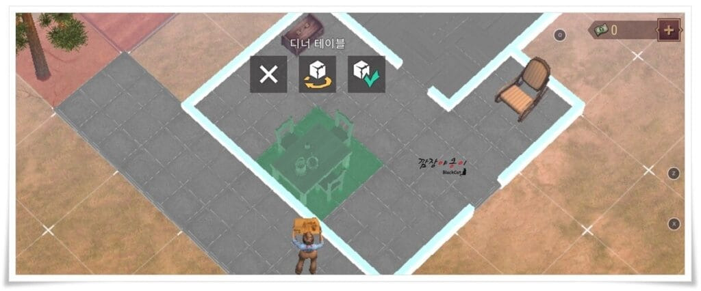 또한 이미 지어둔 건물이나 작업대들의 위치 이동을 시켜줄 수 있습니다. 원하는 설비를 클릭 한 뒤 이동을 눌러 다른 곳으로 배치할 수 있으며 회전시킬 수 있는 기능도 있습니다.