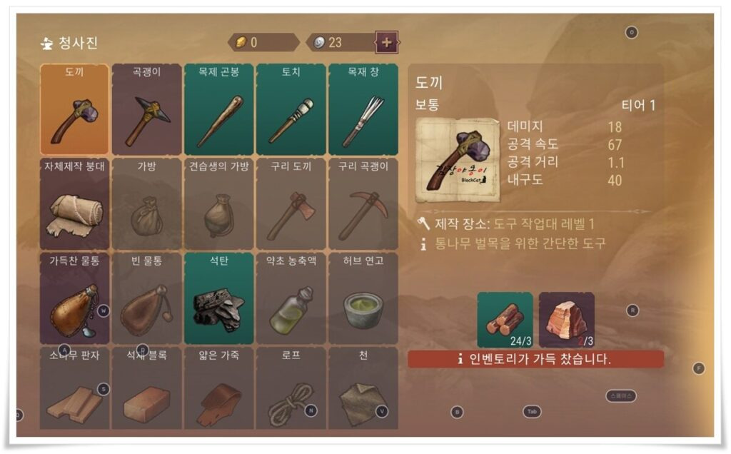 인벤토리 화면은 웨스트랜드 서바이벌 초보들을 위해 직관적으로 되어 있어서 바로 확인하고 이해하기 편하도록 되어 있습니다.