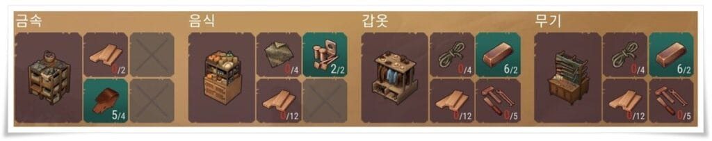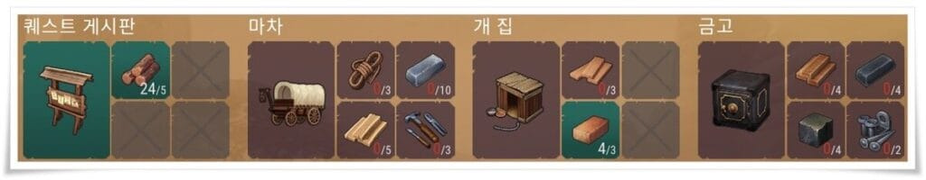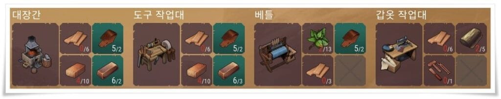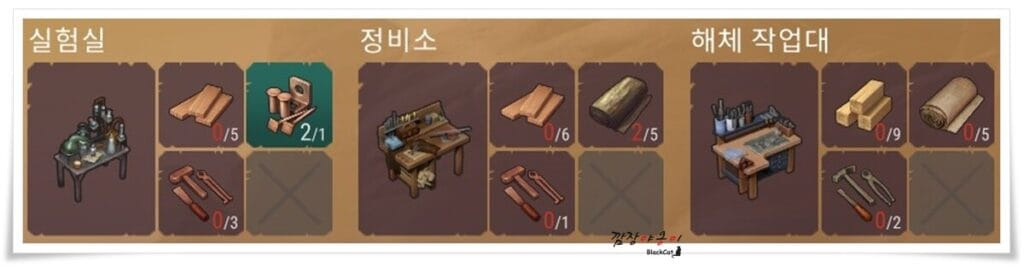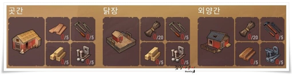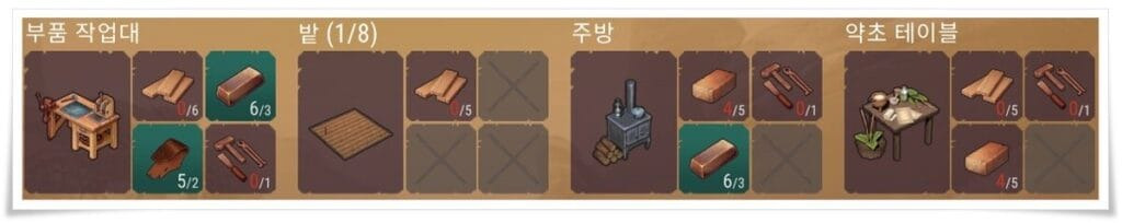 각 건설품에 대한 재료와 목록은 위 사진을 확인하시면 됩니다.