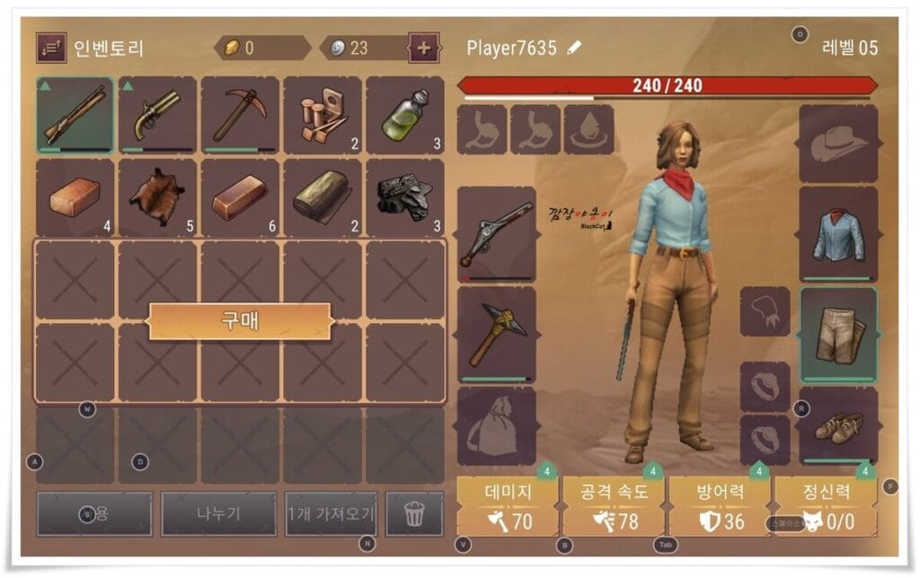 다른점이 있다면 보통 타게임은 렙업시 스킬포인트를 투자하는 창이 따로 있는 경우도 많은데 웨스트랜드 서바이벌에서는 바로 인벤토리 화면에서 렙업 할 때 마다 주어지는 스탯을 데미지/ 공격속도/ 방어력/ 정신력 중 하나를 선택해서 올려 줄 수 있습니다.