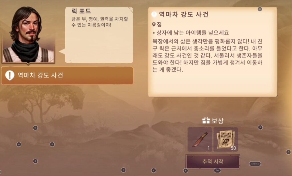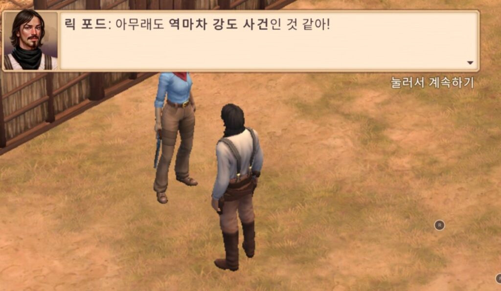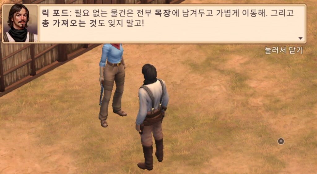 그때 주인공의 친구인 '릭 포드'가 근처에서 역마차 강도사건이 발생한거 같으니 인벤에 있는 물품을 상자에 넣고 가보라고 합니다.