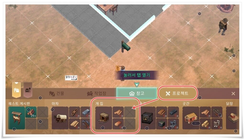 프로젝트를 누르시면 '개 집'이라는 항목이 보일겁니다. '개 집'을 짓는데 필요한 재료로는 '소나무 판자' 3개, '석재 블럭' 3개입니다.