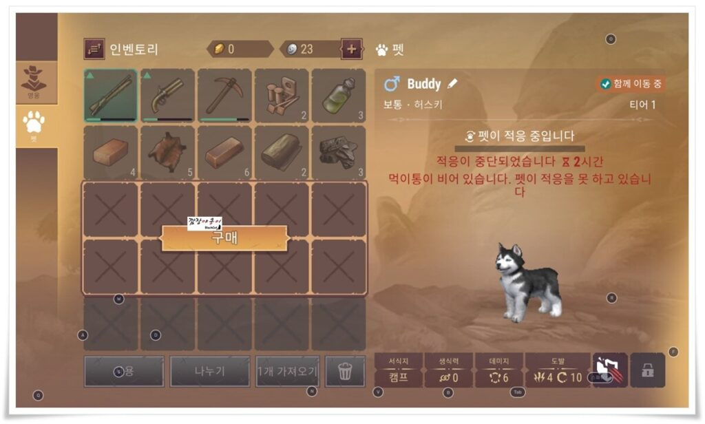 만약 저 문구가 떠 있지 않다면 대려온 강아지를 펫으로 만들 수 없고 사라지거나 저희 게임친구 처럼 집도 없고 성장도 없이 어린 강아지 모습으로 집에서 빈둥거리는 놈으로 지낼 수 있습니다.