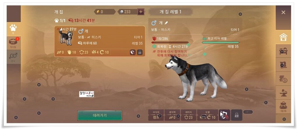 지금 제 허스키 펫이 티어1 35랩인데 더 이상 성장을 안하는 듯 하네요. 이게 티어1이 35랩이 한계인건지 개집이 1이라 그런건지 '펫 하우스'를 아직 만들지 않아서 그런건지 잘 모르겠는데 나중에 추가 사항이 생기면 기재해 두도록 하겠습니다.