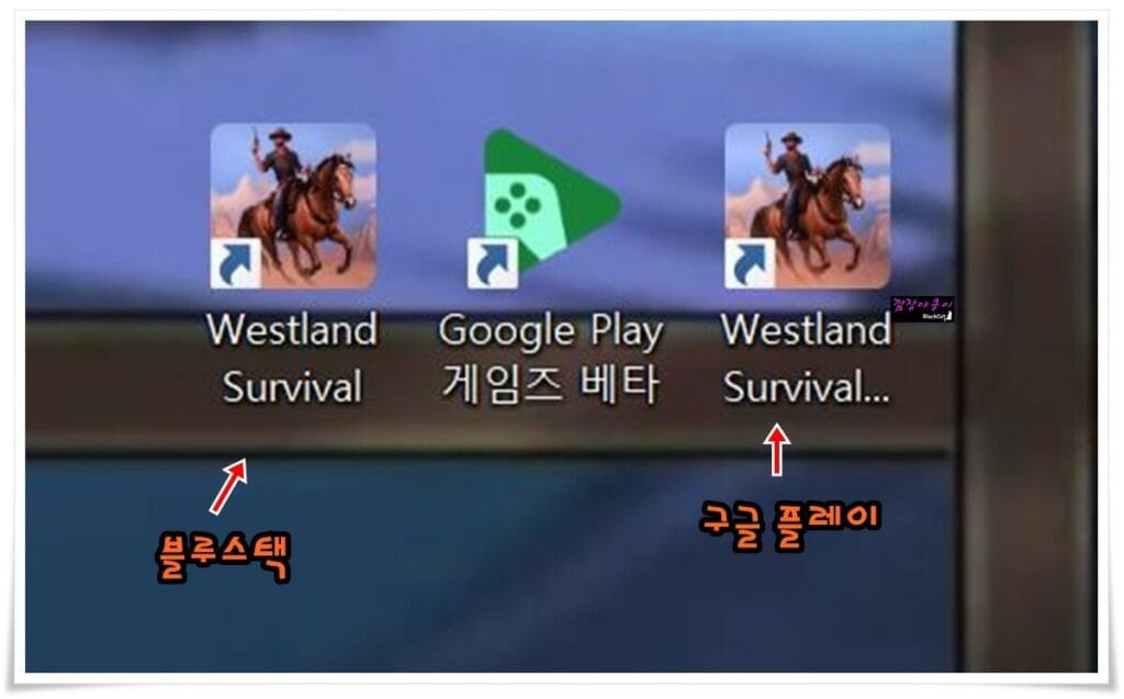 웨스트랜드 서바이벌 PC버전 설치가 끝났습니다. 왼편에 있는 아이콘은 블루스택용이고 오른편에 있는 아이콘은 구글 플레이 게임즈 베타버전인데 아이콘이 동일하네요.
