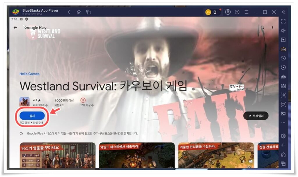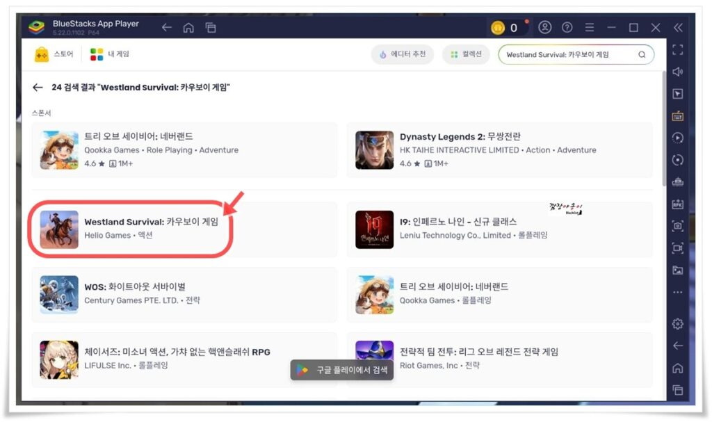 검색에서 나온 웨스트랜드 서바이벌(westland survival)을 선택하신 뒤 '구글 플레이에서 설치하기'를 클릭합니다.