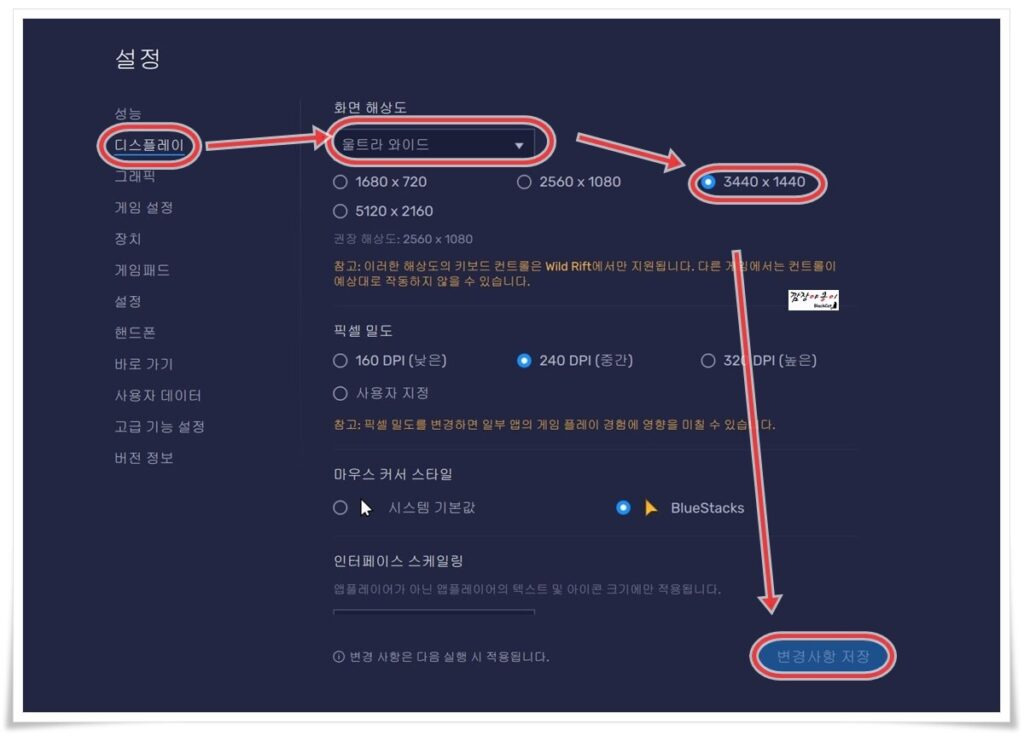제가 지금 집에서 사용중인 모니터는 울트라와이드 타입이라 게임이 잘려 나오는데요. 오른쪽 위에 있는 '삼선'이나 오른쪽 아래 있는 '톱니바퀴'를 눌러 설정창을 연 뒤 '디스플레이→화면해상도→울트라와이드→해상도 선택→변경사항 저장'을 차례로 하시면 꽉찬 화면을 게임 플레이가 가능합니다.